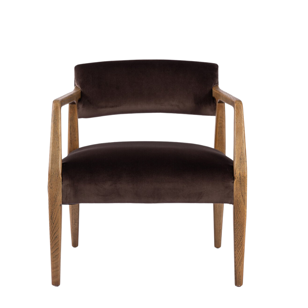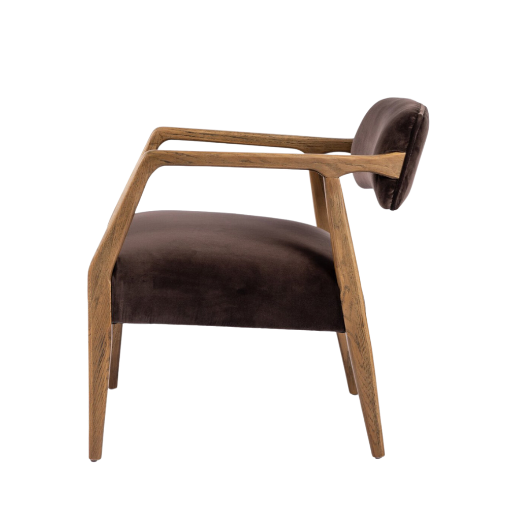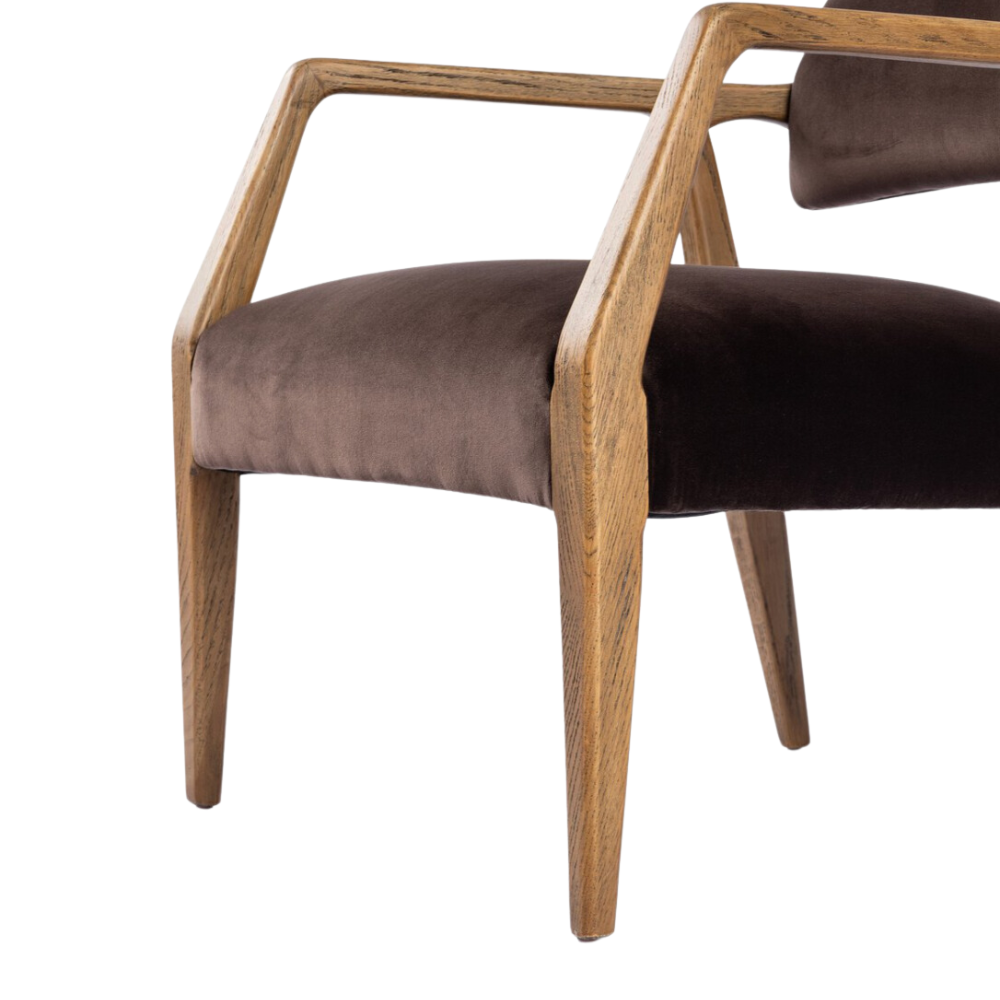 Made with an angular frame from distressed nettlewood and upholstered in a velvety cocoa cotton. Features a deep seat and striking, low-slung back.
