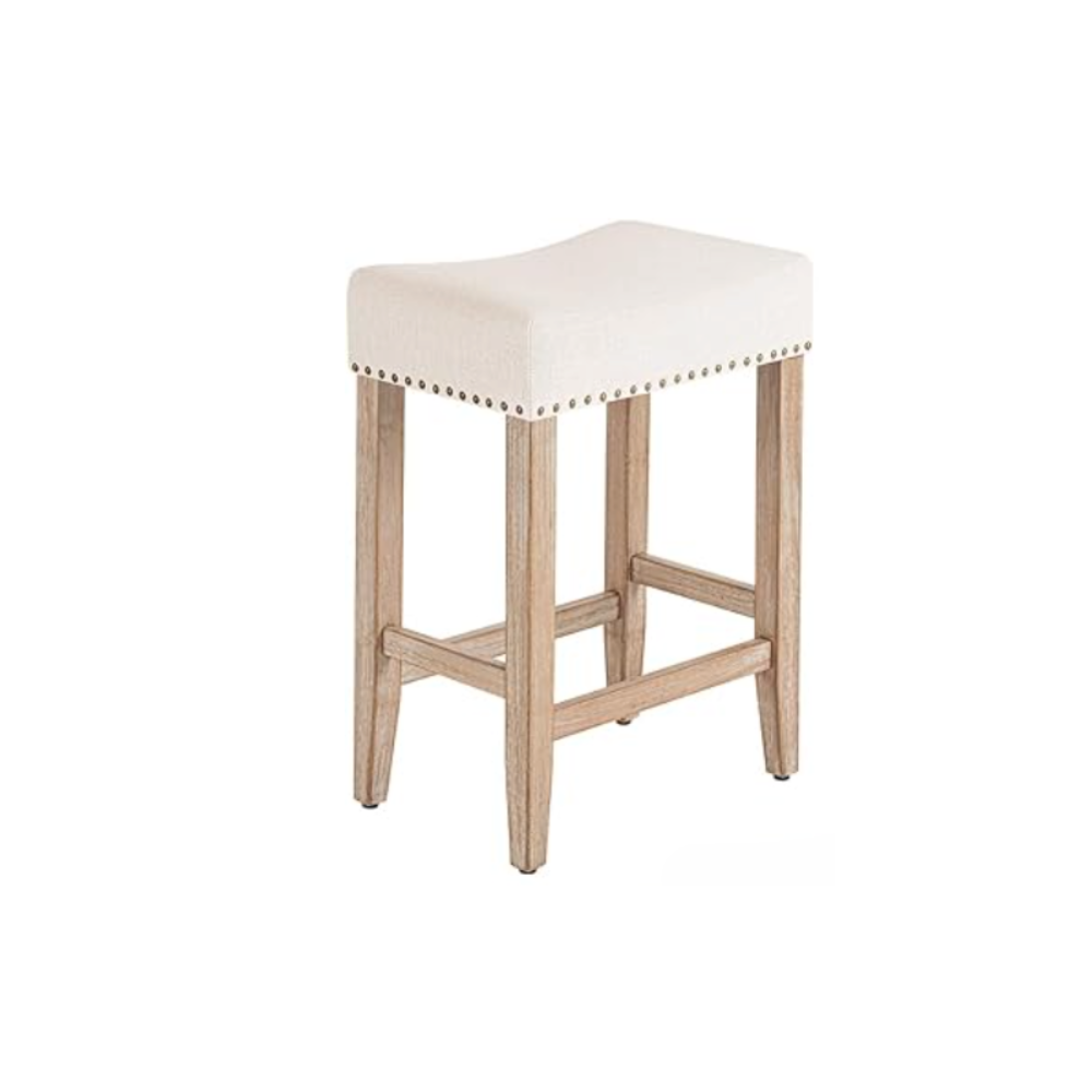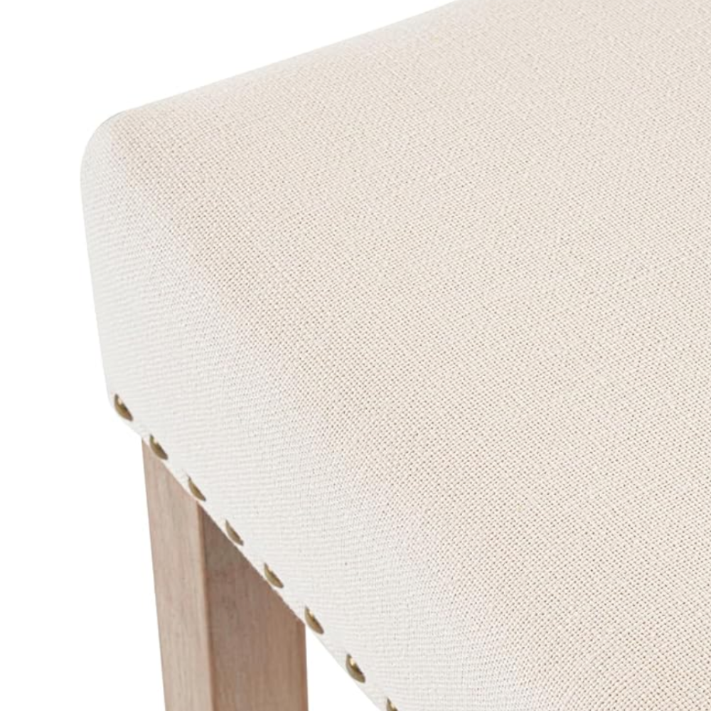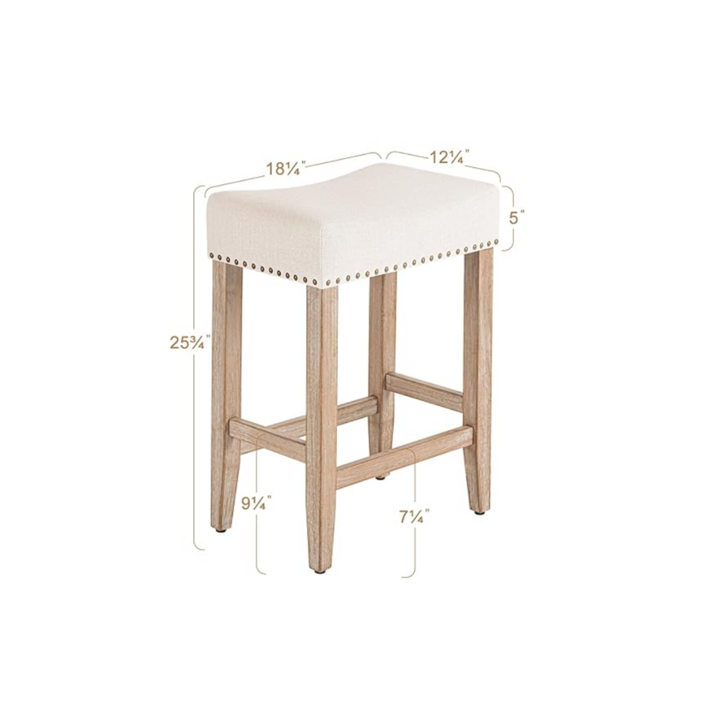 These classic wood turned legs with neutral fabric cover and muted gold nail head trim. This counter size stool fits fits comfortably at bar height and shorter tables.