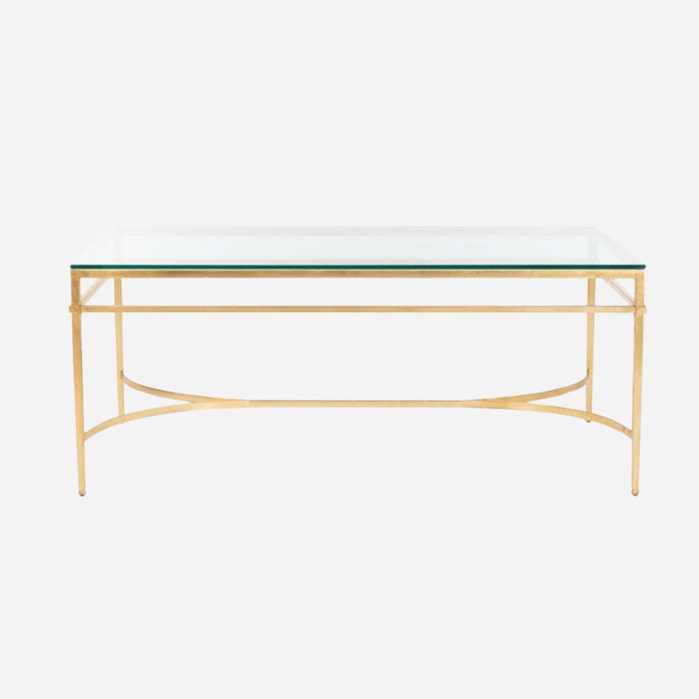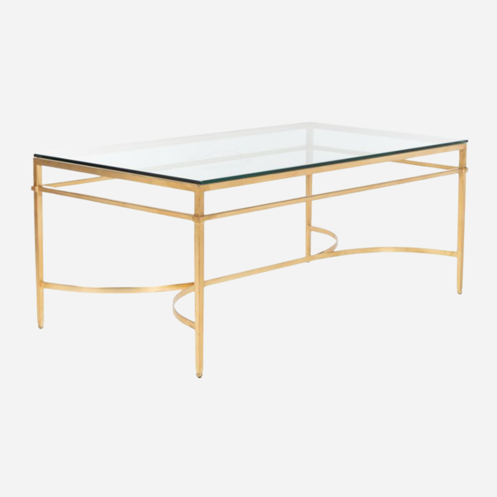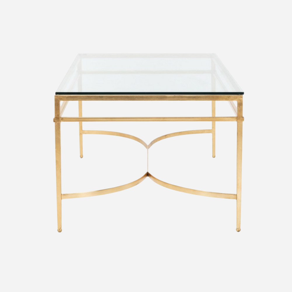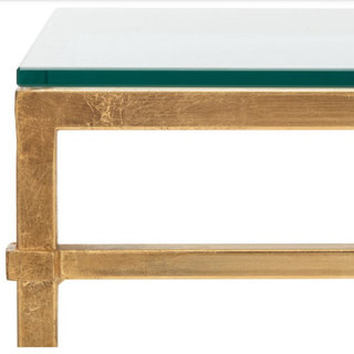 Metal gold leaf finish with rectangular lines, simple, and modern shape with a glass top makes it pop in the middle of any seating.
