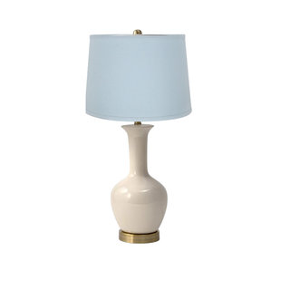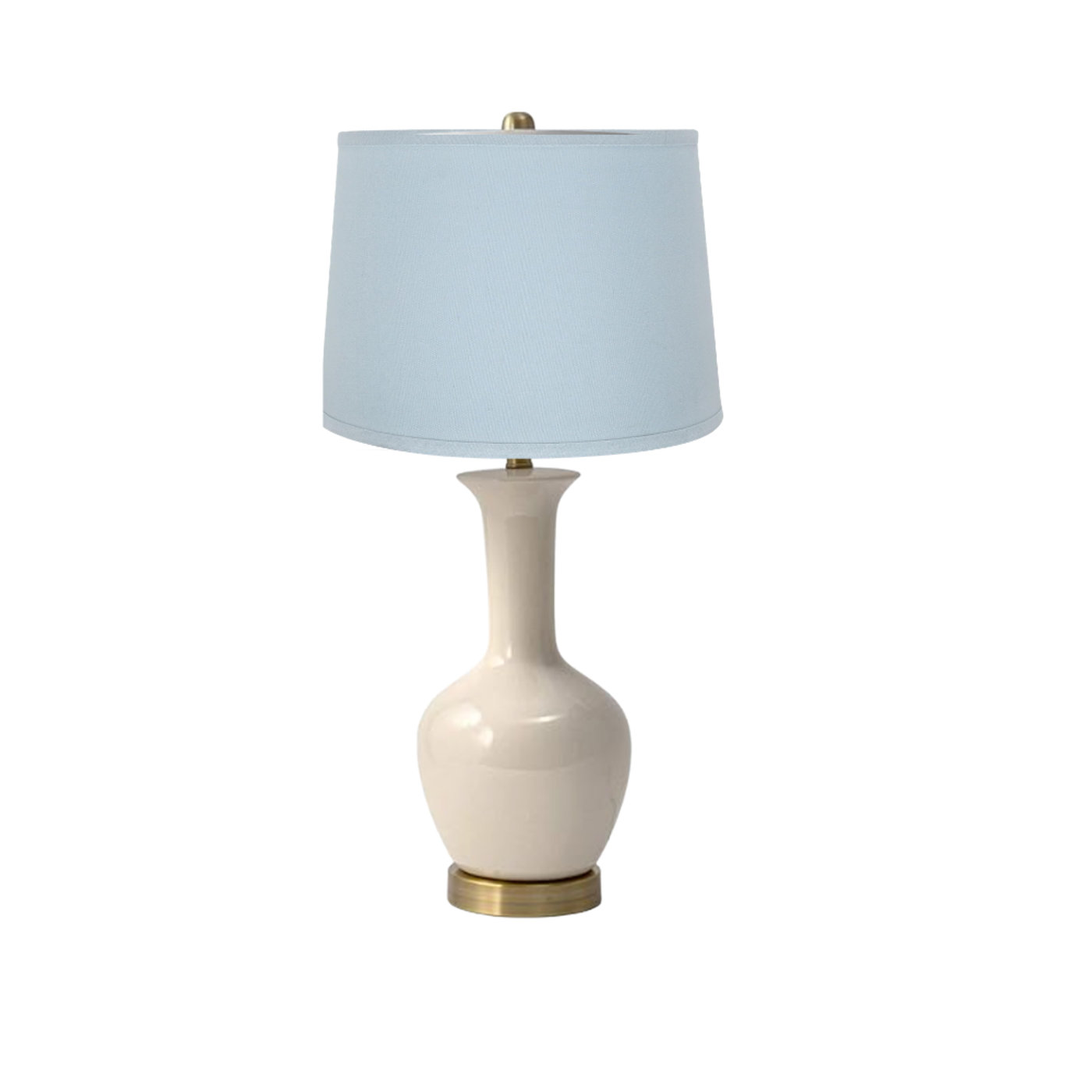 Our Blue Crane lamp features a light blue fabric shade, off white gourd base, and a vintage finial. Light and airy vibe