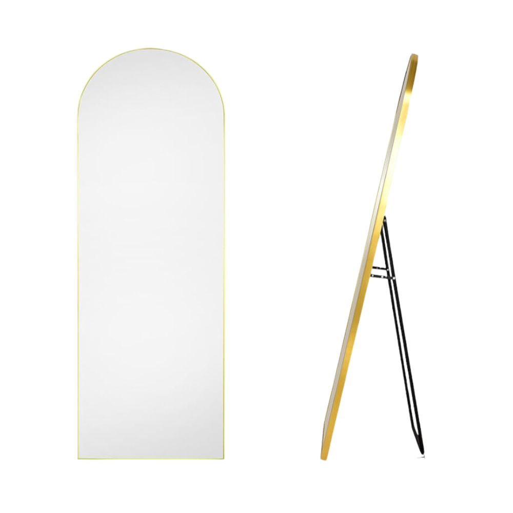 Gold arched framed mirror with kick back stand. Simple and classic for welcome sign, seating chart, or marriage quote.