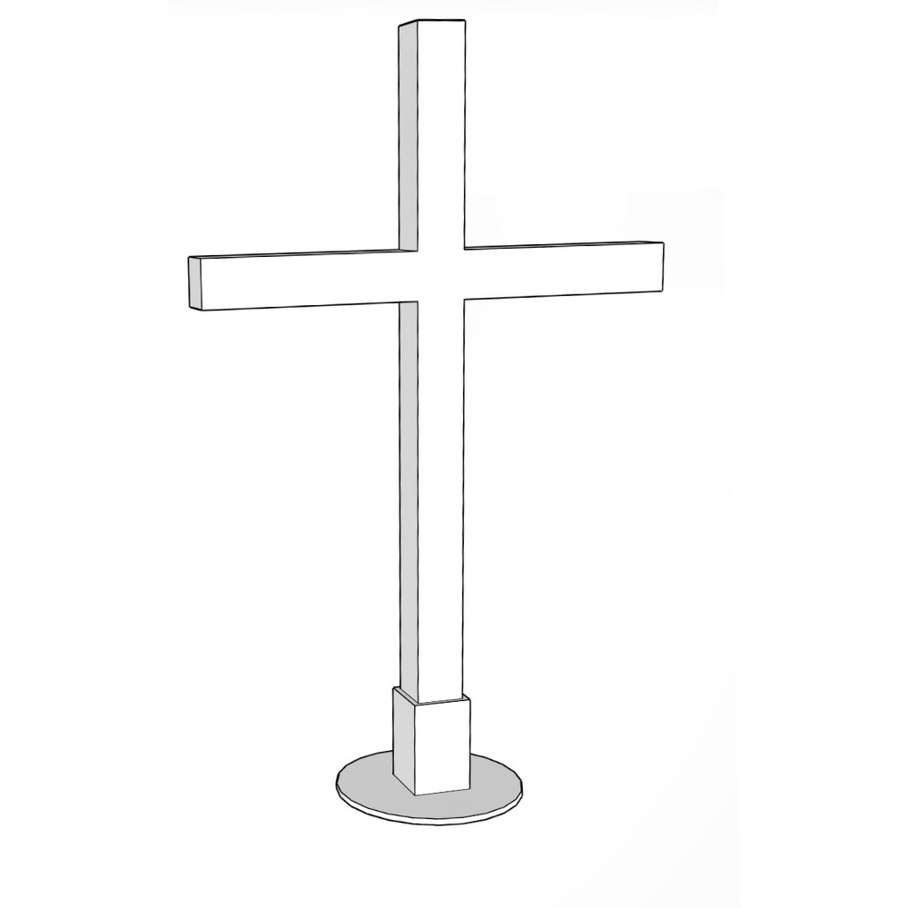White cross standing 8ft tall x 5ft wide with round stand. Handmade by a local craftsman using highend grade wood fashioned into 6"x6" posts.