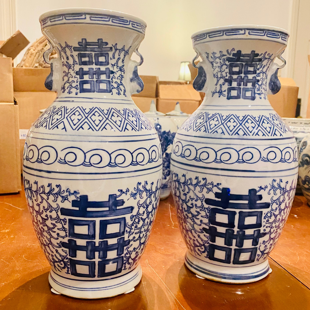 Handpainted chinoiserie urns. The good stuff. Asian characters no lids