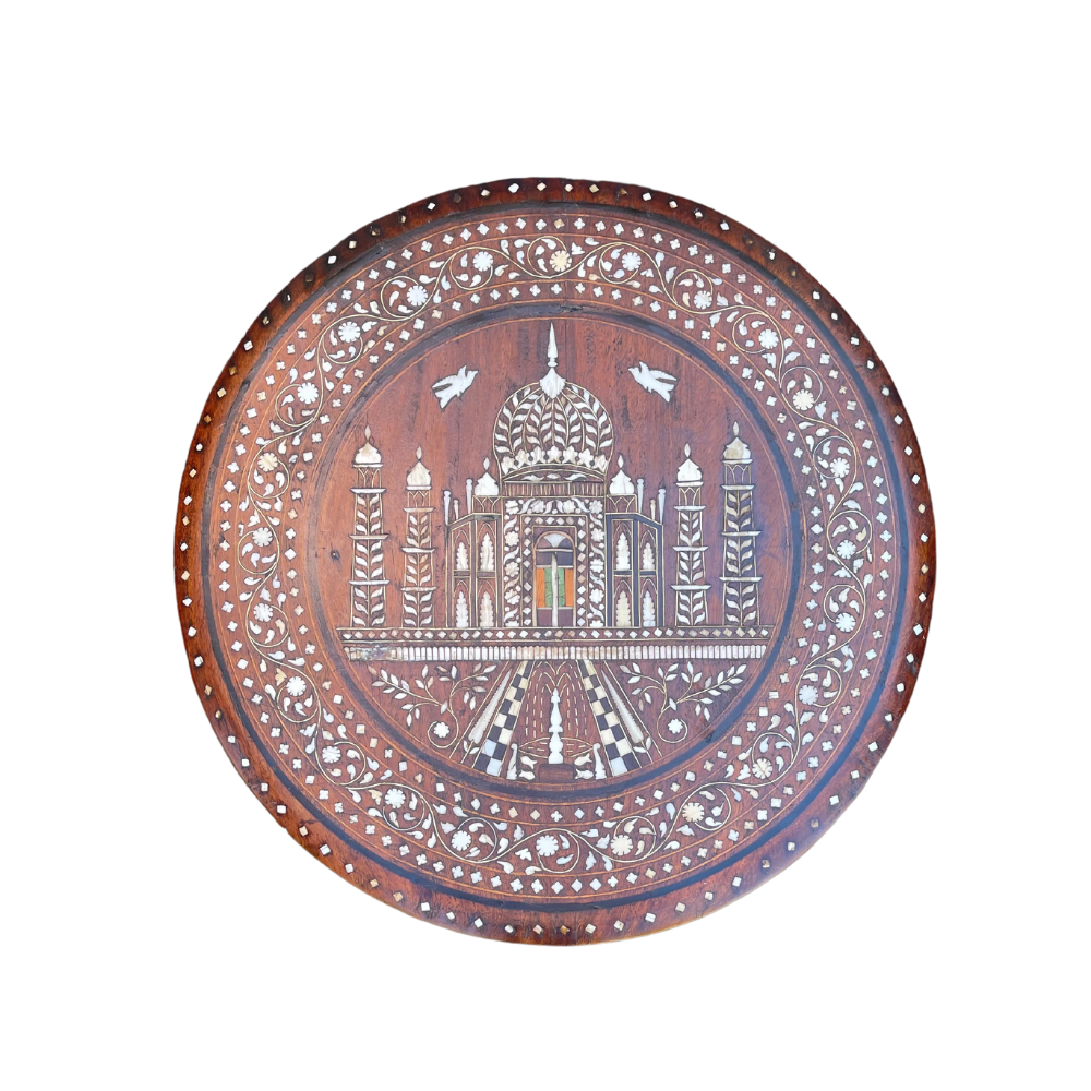 vintage Indian souvenir table with mother of pearl inlay, carved elephant heads, and tusks.
