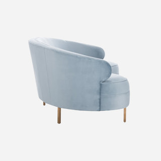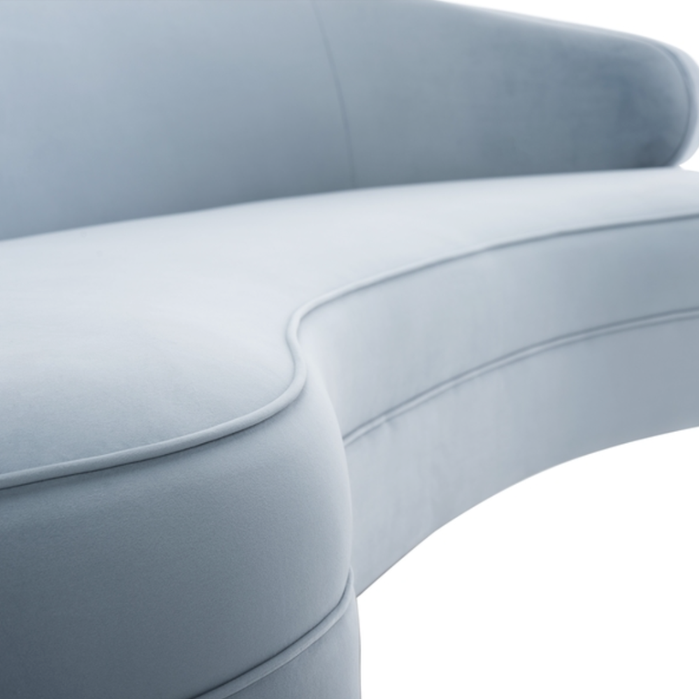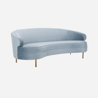 The deluxe curves of this glamorous classic sofa. Designed for the minimalist and pairs the richness of light blue velvet upholstery with sleek legs in a gold finish. Its a stunner!