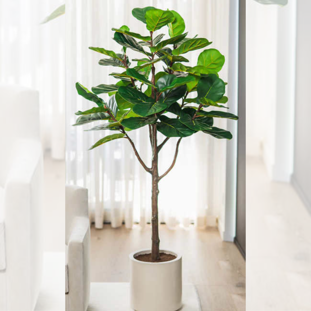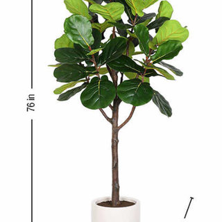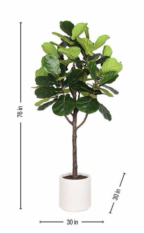 Tall (6'3") with 56 faux vibrant leaves with wire stems for shaping. The trunk is hand painted for texture and dimension. White modern pot included. weighs 25 lbs