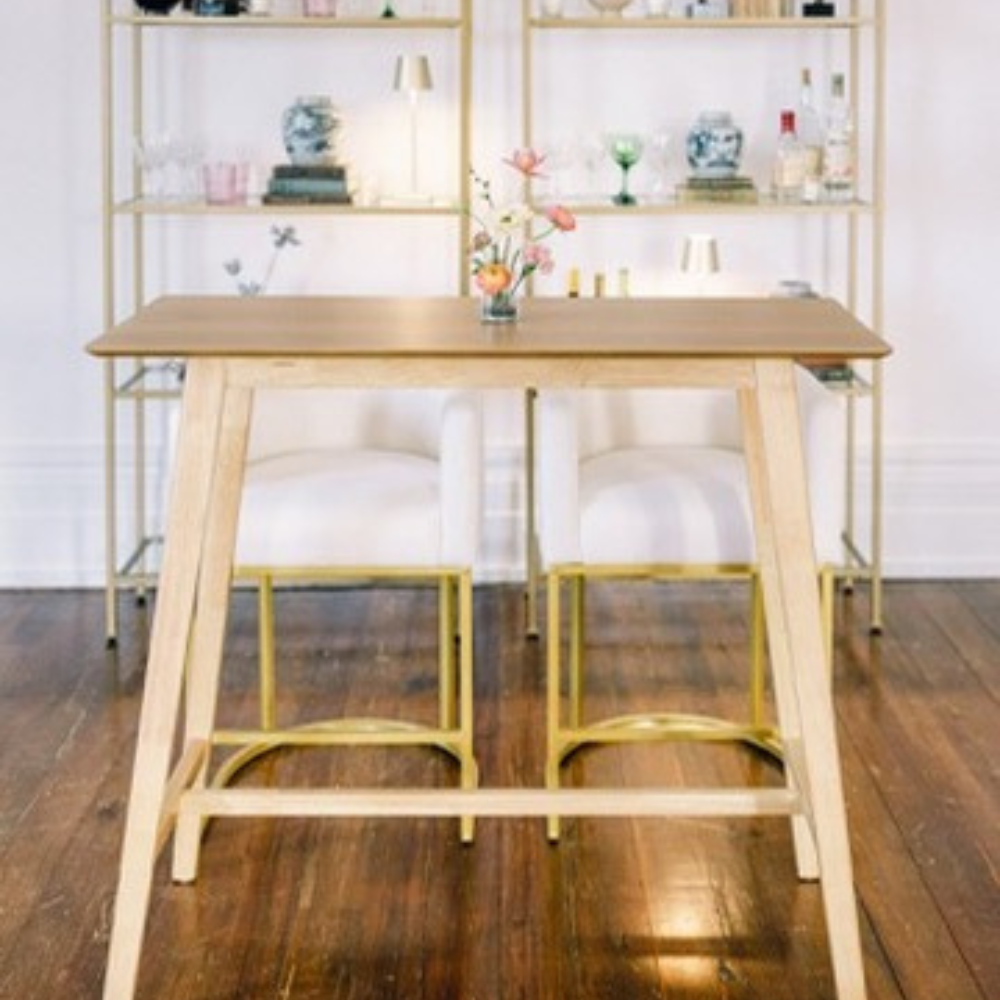 Light oak wooden bistro tables. No need for linens here. These will accommodate 2-4 people
