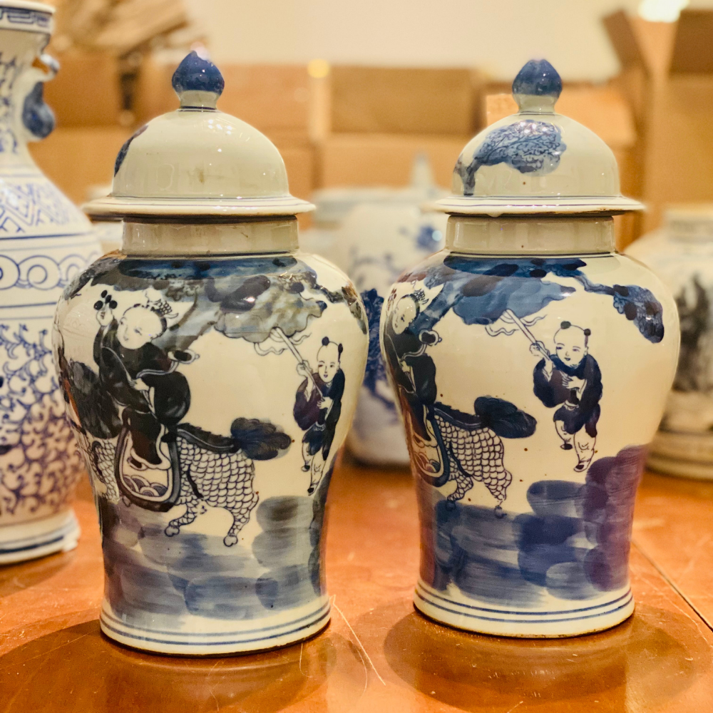 Handpainted chinoiserie: the good stuff! Features kids riding on horseback with a lid