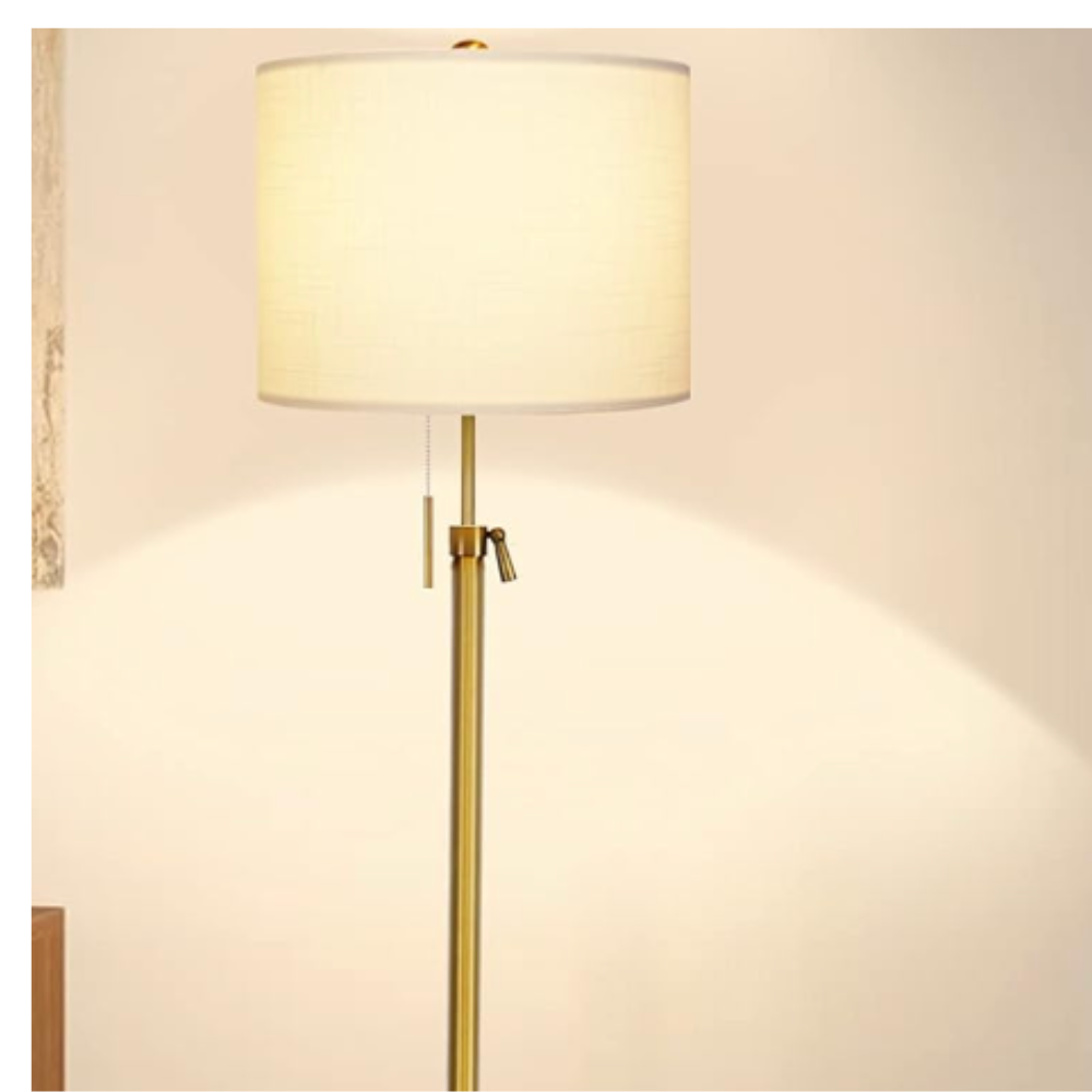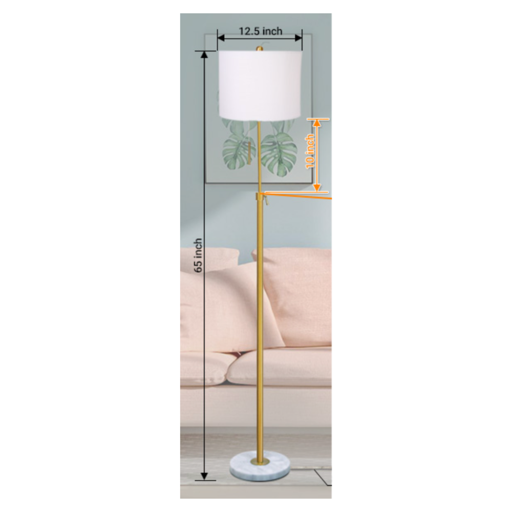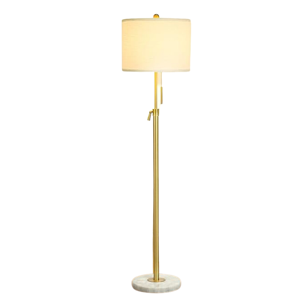 gold adjustable floor lamp with pull chain on/off and marble base. Cream shade