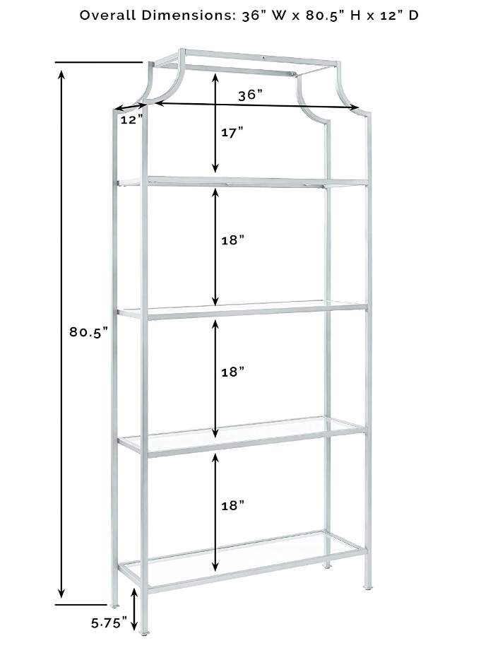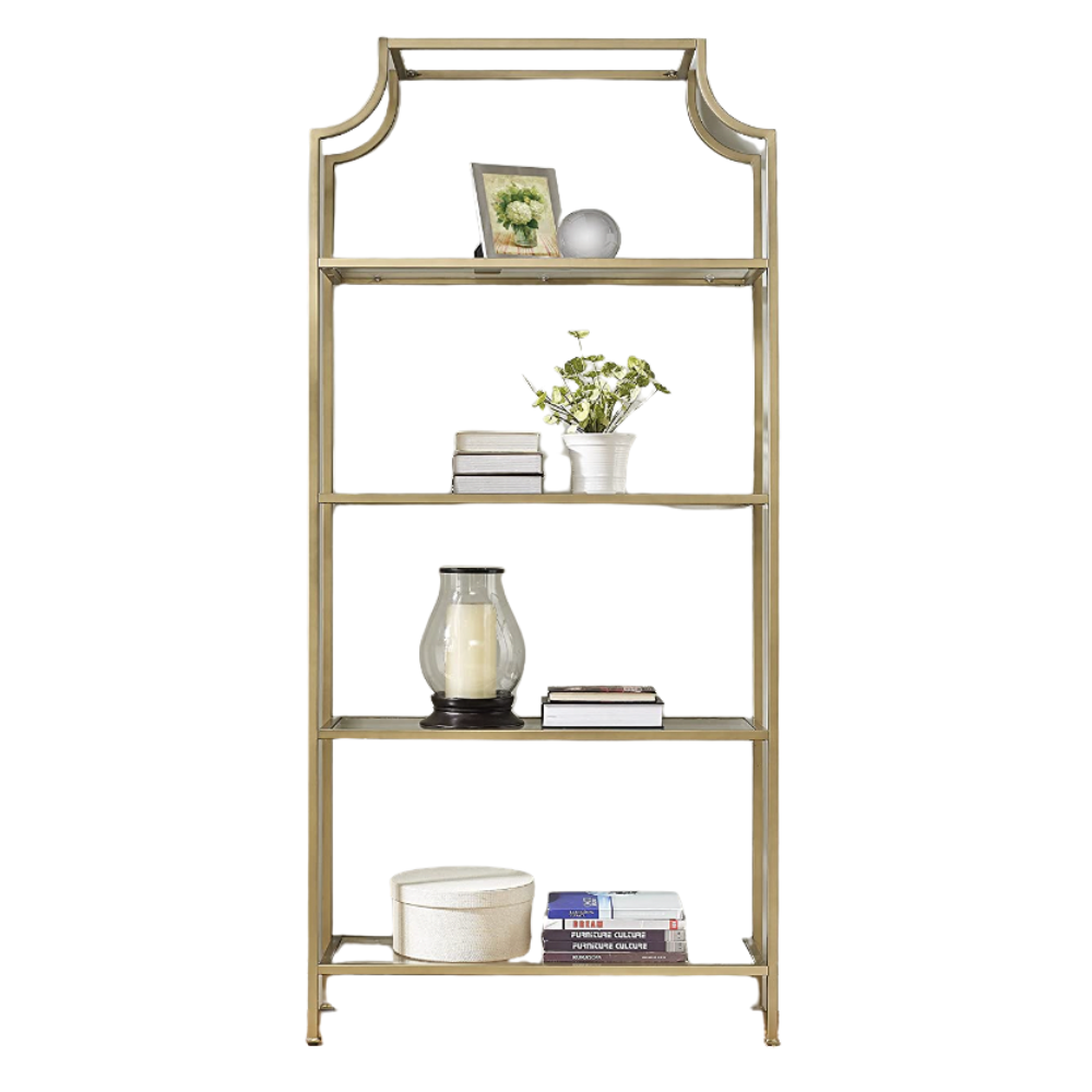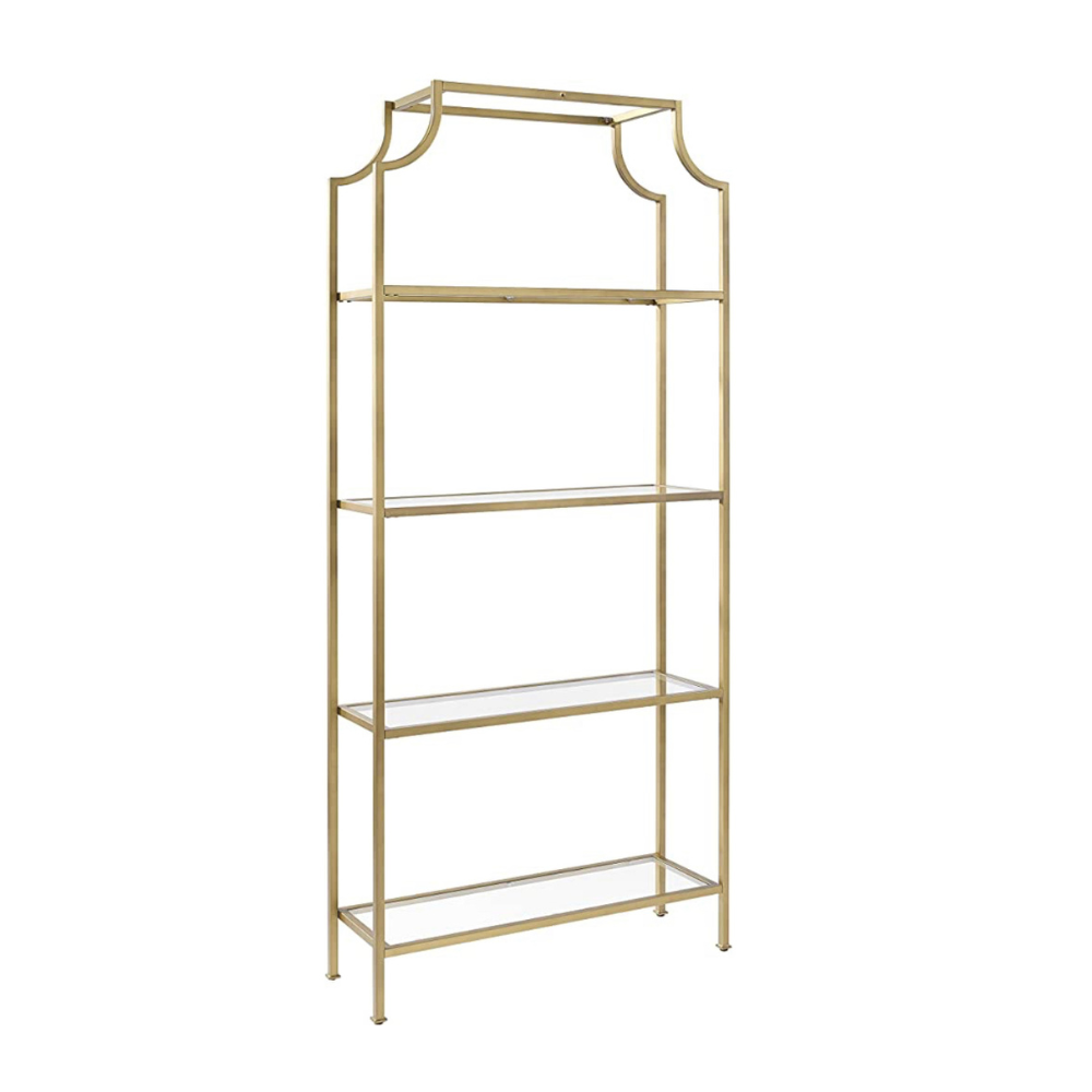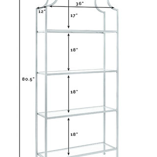 Elegant gold and glass shelving great for florals, bar backs, serving dessert, or any kind of display. Overall Dimensions: 36" W x 80.5" H x 12" D