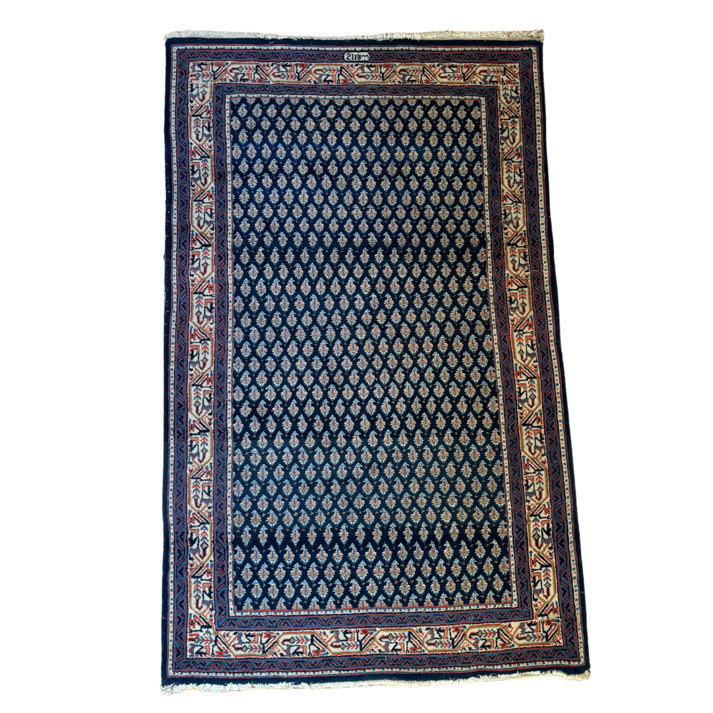 Vintage Hand Knot from the middle east. Beautiful lapis blue with cream, navy, and russet boarder. Signed by weaver. Handle with care