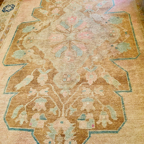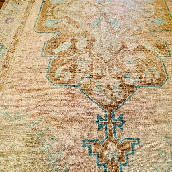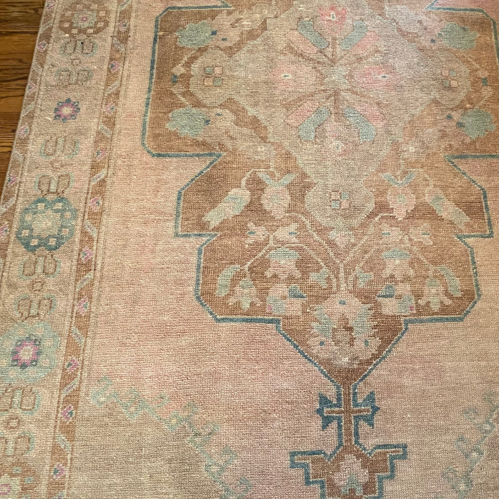 Vintage Hand Knot. Turkish beauty... she is the perfect muted combo of light salmon, pink, tan, cream, and blue. Adorned with geometric florals