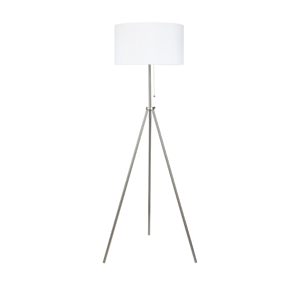 Silver adjustable floor lamp with pull chain on/off. White shade.