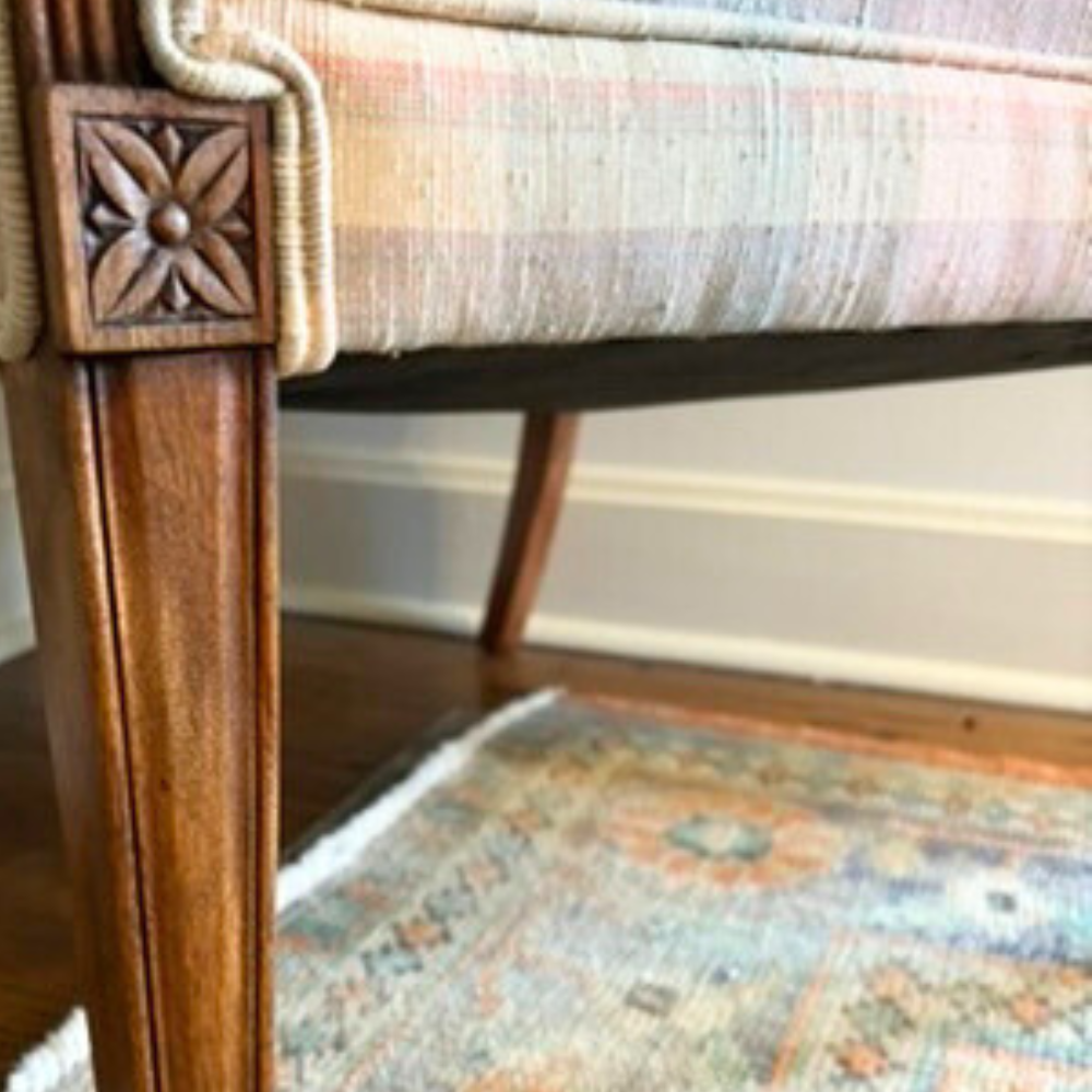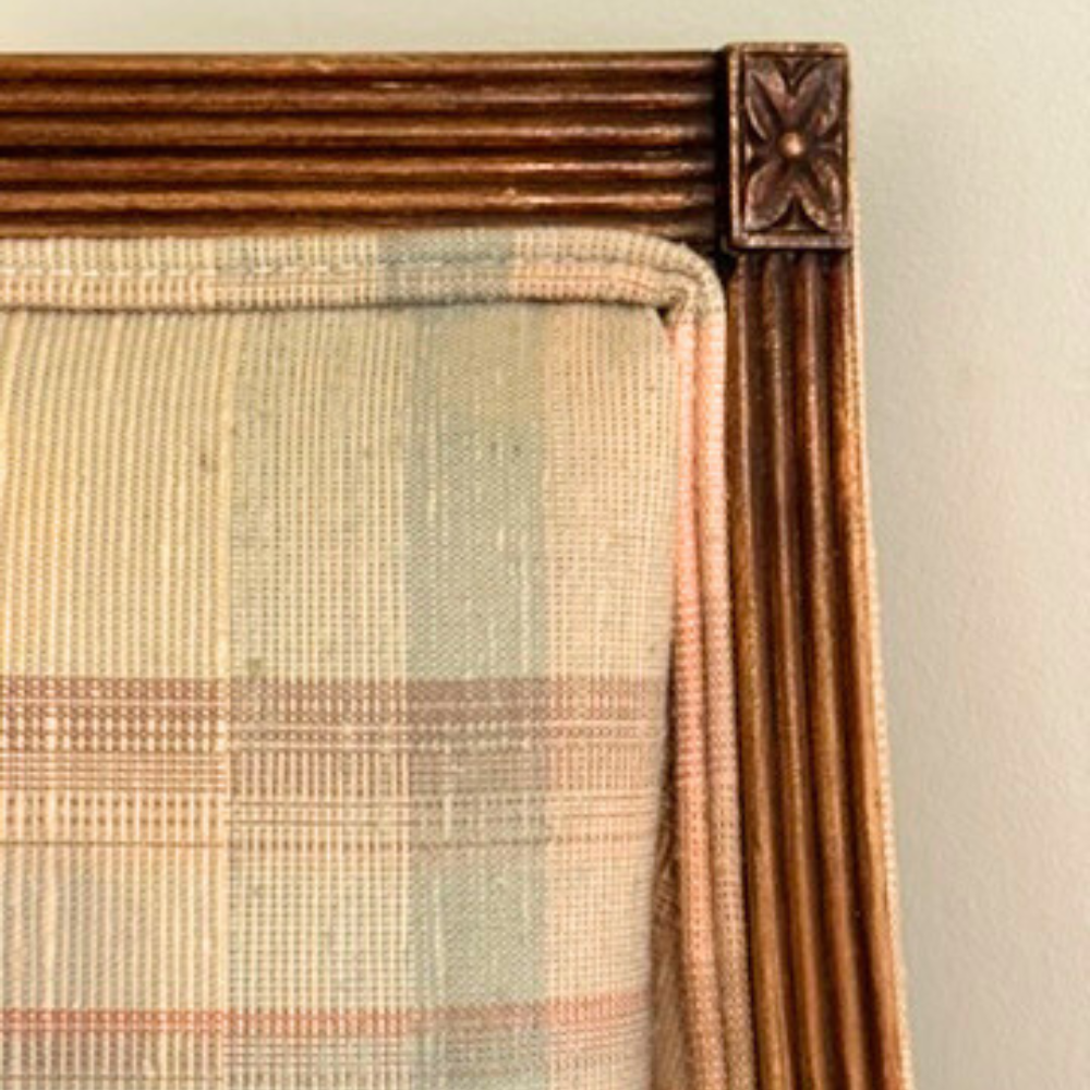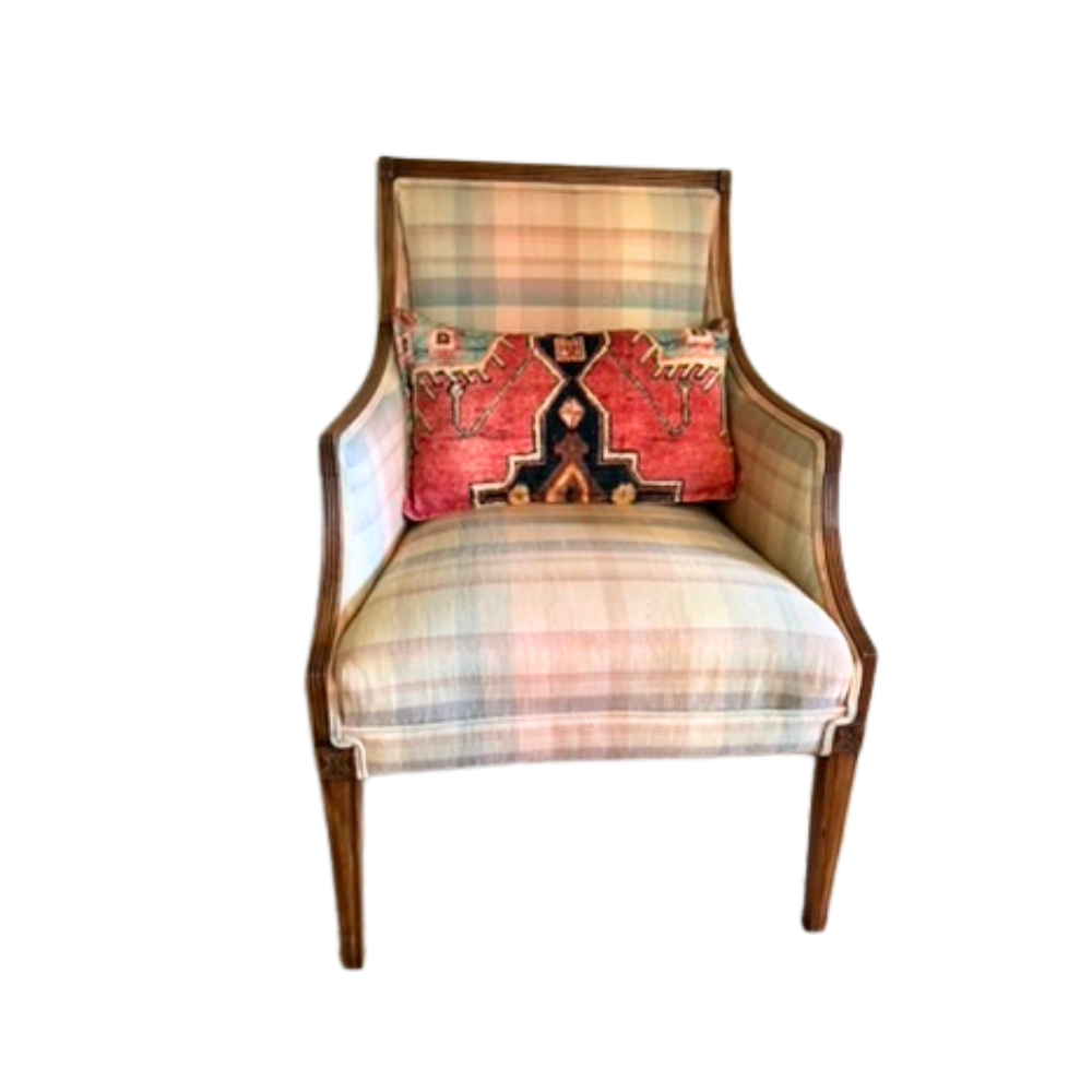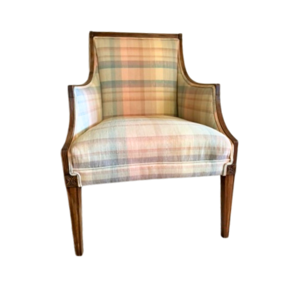 Vintage Ralph Lauren style country French accent chairs approx 1940s with update upholstry from 1980s. Pastel plaid textured poly/linen fabric. Beautiful deep caramel color wood trim with delicate carvings.