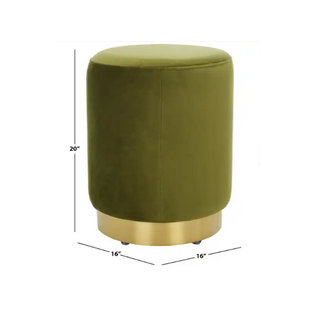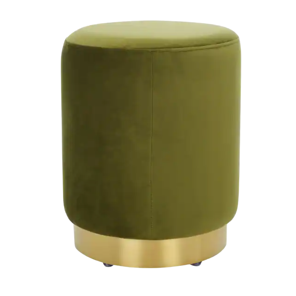 Modern ottoman in rich olive velvet with a matte gold base versatile for seating as the guest list grows