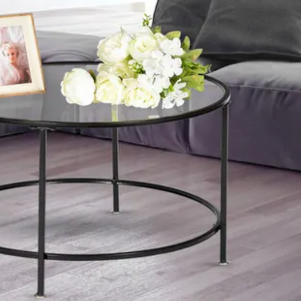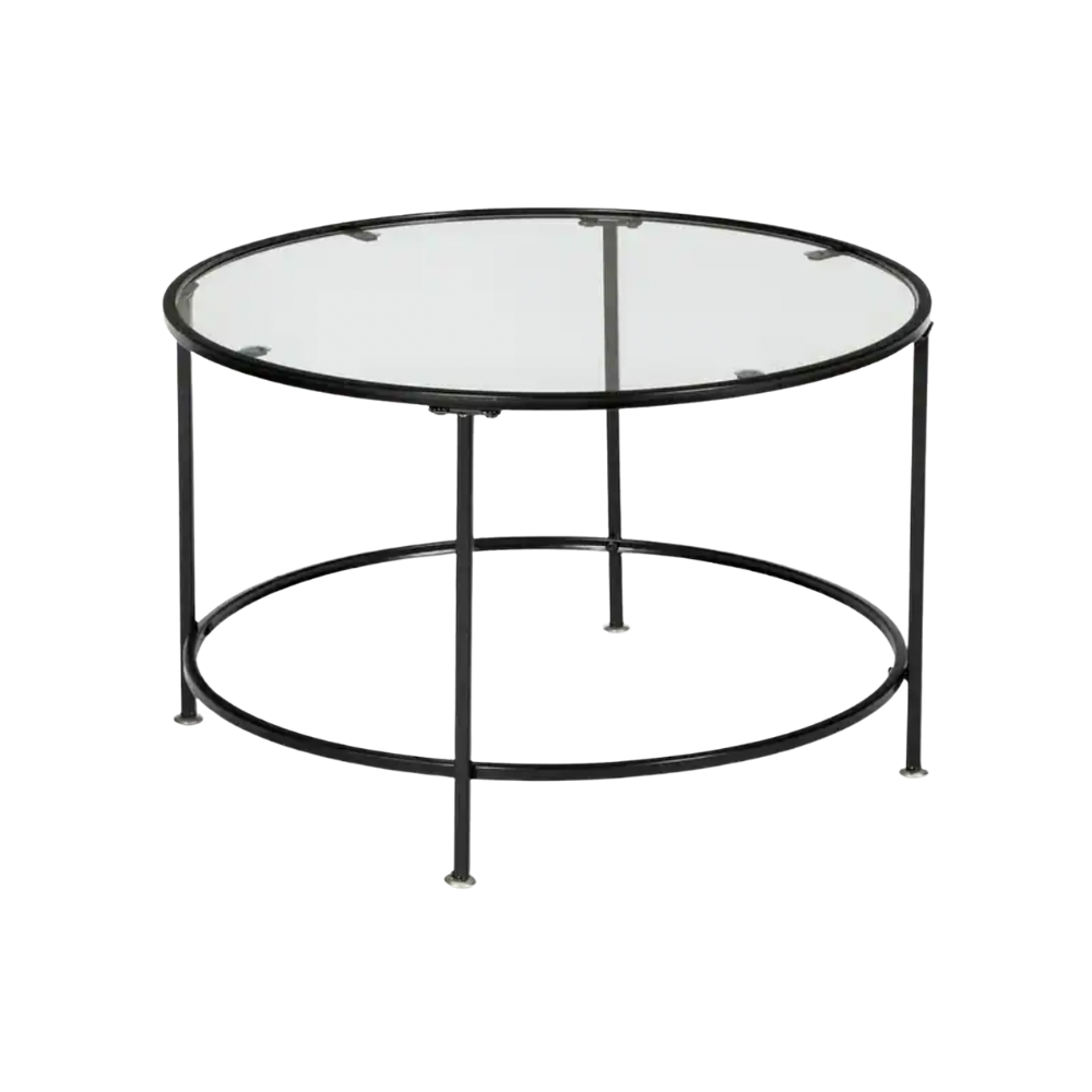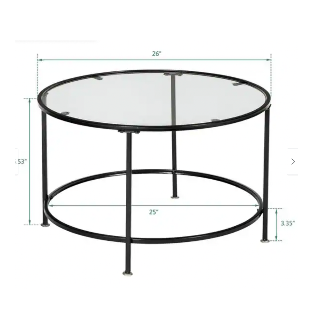 Black metal frame round glass coffee table fits in just about anywhere. Graceful accent, but strong lines