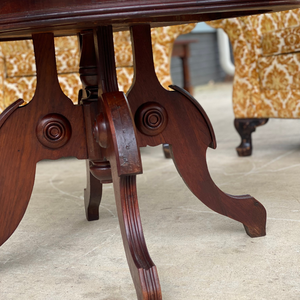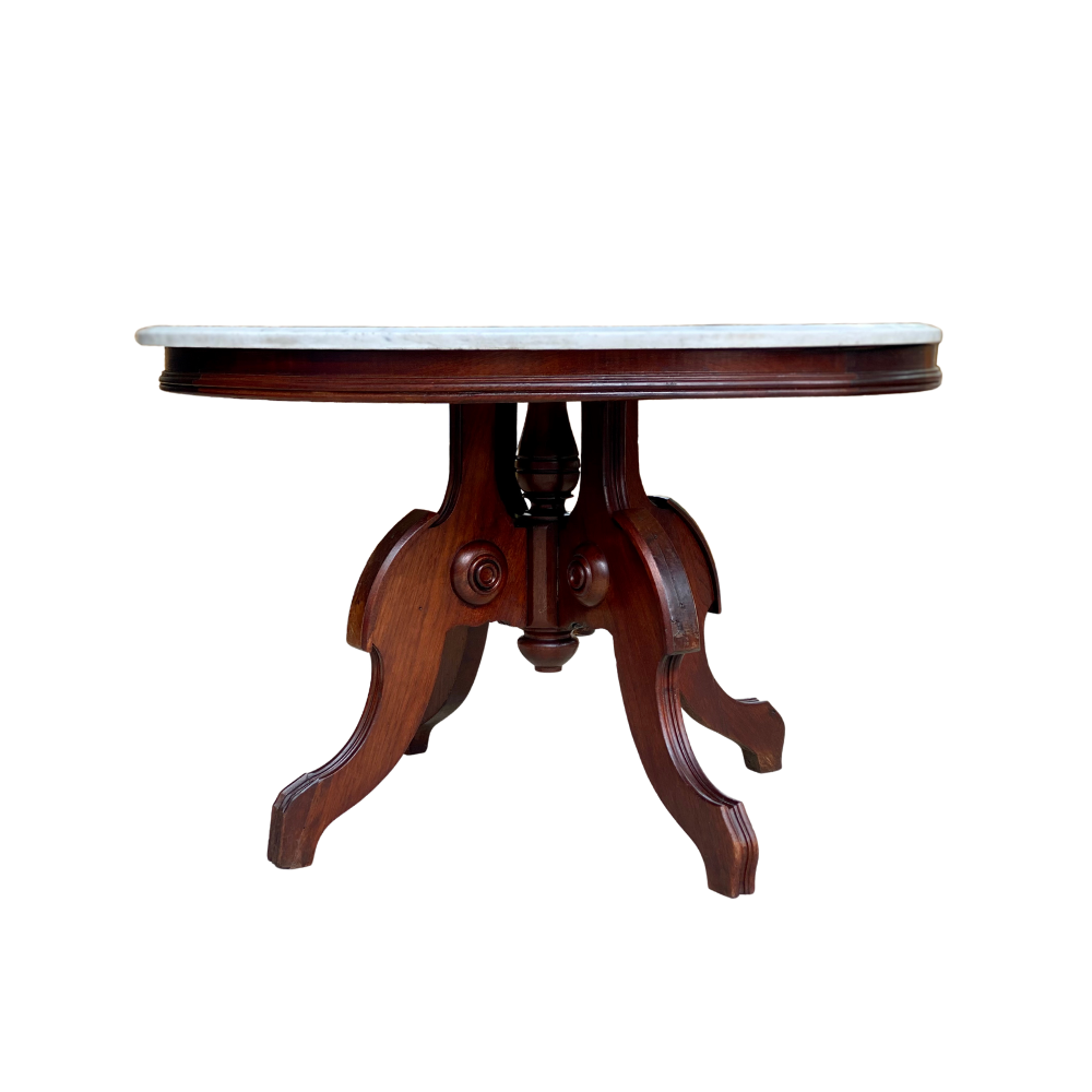 Victorian beauty... carved wood base that holds up a beautiful and heavy marble top. This family jewel will add boat loads of character