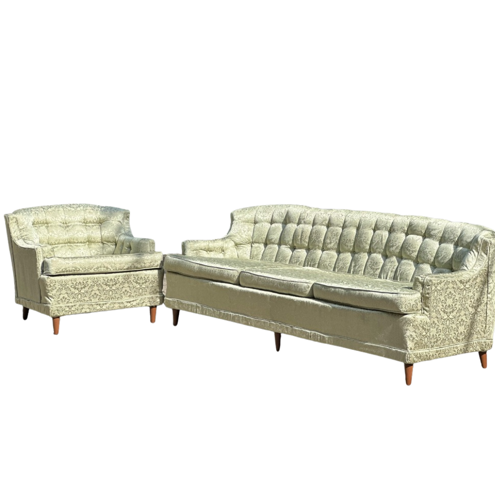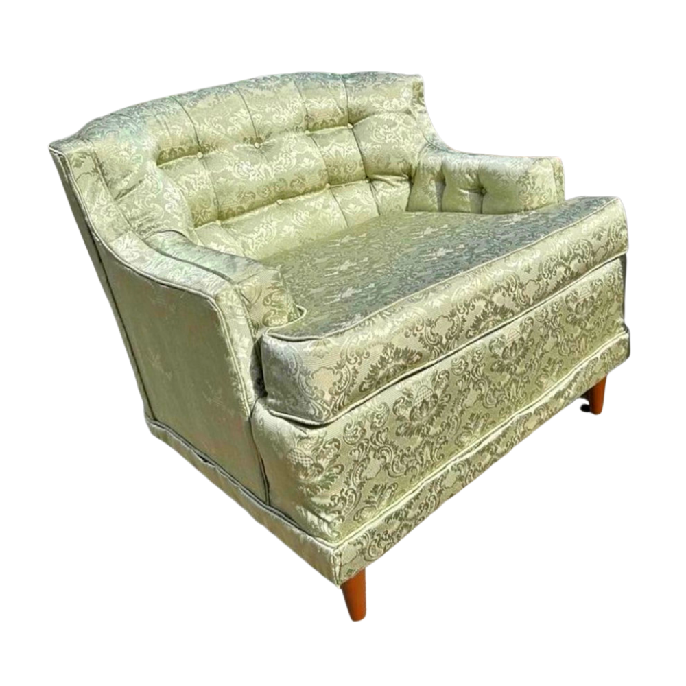 Verde on Verde is a direct match back to our Gronn Sofa. This MCM-ish club chair has all the comfort and all the features. She is a light green botanical brocade fabric with pencil legs.