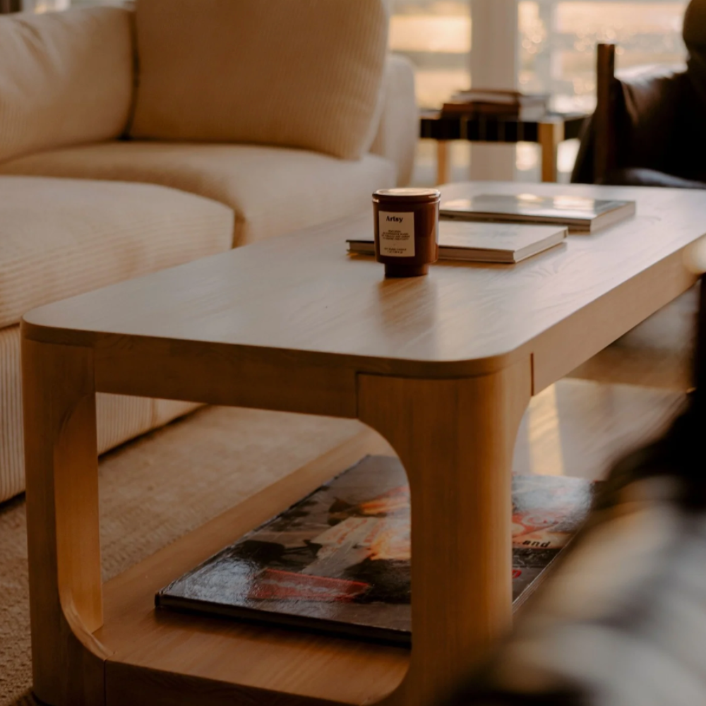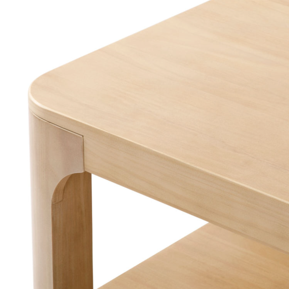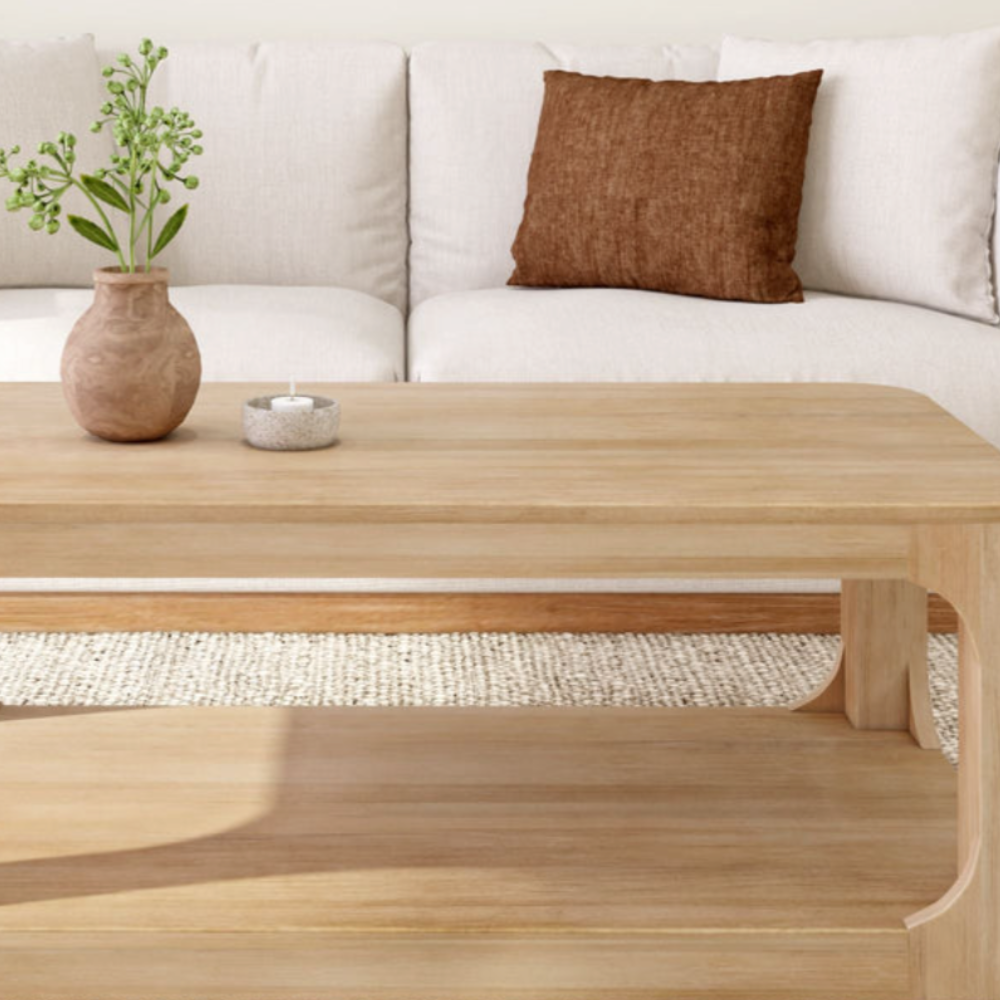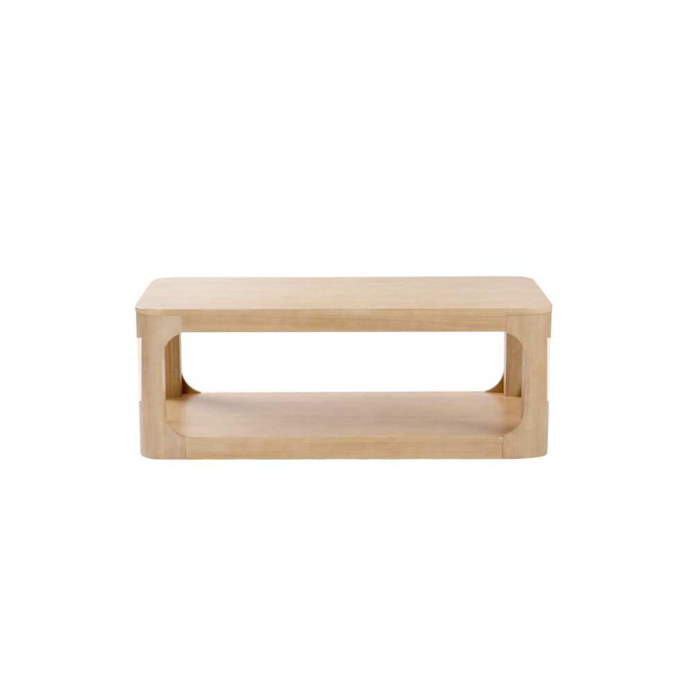 Crafted with knot-free pecan colored solid pine. This coffee table pairs modern neutral finishes with a sleek and rounded design. Perfect for a variety of seating types.